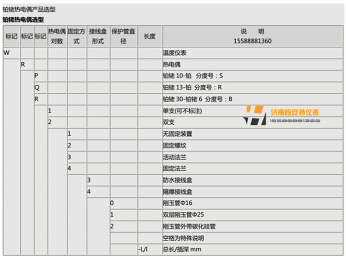 7.鉑銠熱電偶選型列表: