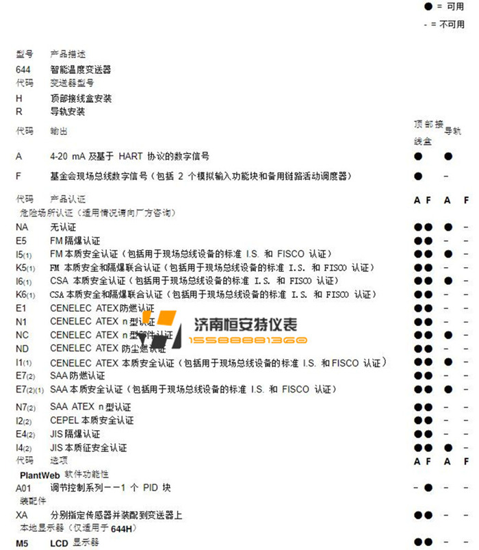 羅斯蒙特644溫度變送器選型列表: