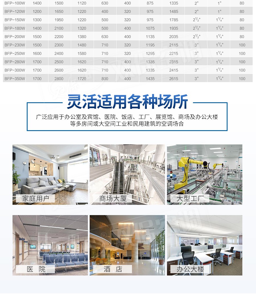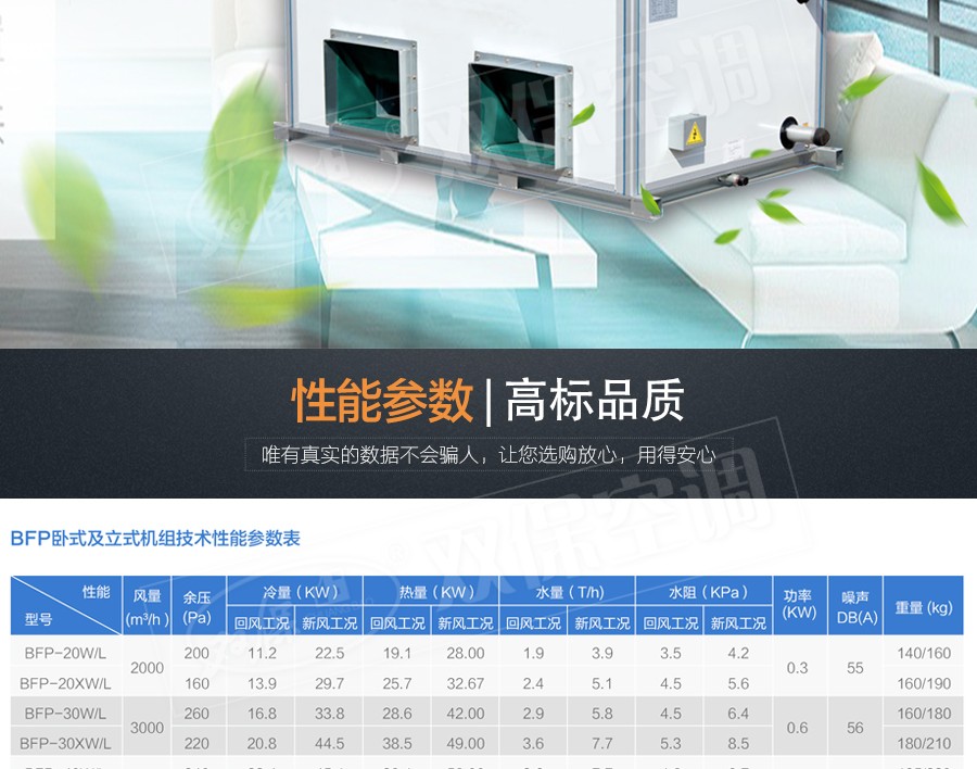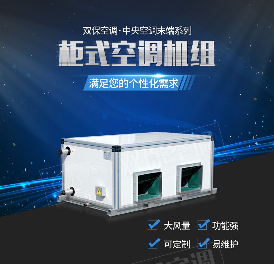 江蘇雙保空調(diào)有限公司—BFP系列柜式空調(diào)機(jī)組可實(shí)現(xiàn)對(duì)空氣的加熱、冷卻、加濕、過(guò)濾凈化等多種功能。廣泛應(yīng)用于賓館、商場(chǎng)、機(jī)場(chǎng)、醫(yī)院、寫字樓等大中型公共建筑的舒適性空調(diào)和電子、紡織、化工、制藥、食品等行業(yè)的工藝性空調(diào)。該機(jī)組不僅具有制冷供熱性能優(yōu)越、噪音低、高度薄、結(jié)構(gòu)緊湊、重量輕、安裝維護(hù)方便的優(yōu)點(diǎn),而且還可以配上調(diào)頻或調(diào)壓變速控制器后。按四季不同工況與現(xiàn)場(chǎng)空調(diào)場(chǎng)合匹配進(jìn)行變風(fēng)量節(jié)能運(yùn)行。因此特別適用于建筑物緊湊的各類空調(diào)工程場(chǎng)合使用。