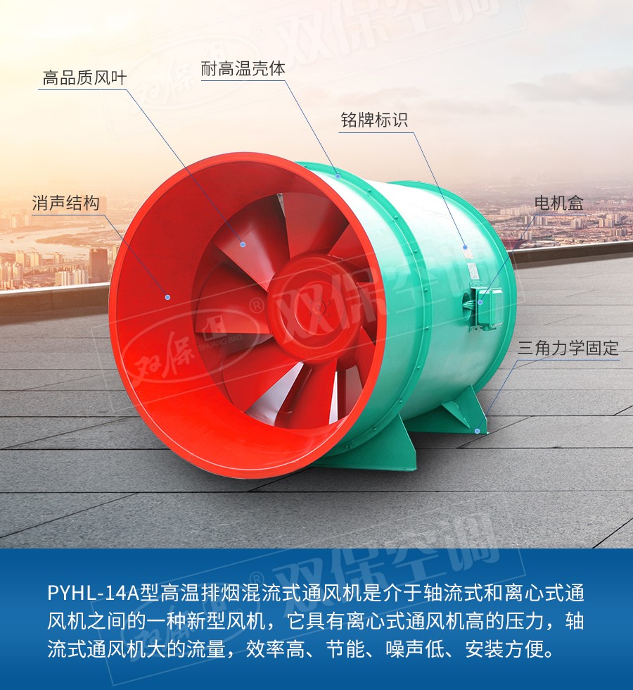 江蘇雙保空調有限公司—PYHL-14A高效低噪混流式高溫排煙風機可用于高層建筑、地下建筑的防排煙系統(tǒng)。具有效率高、噪聲低、用途廣,平時通風接氣與火災時消防排煙一機兩用的特點。
