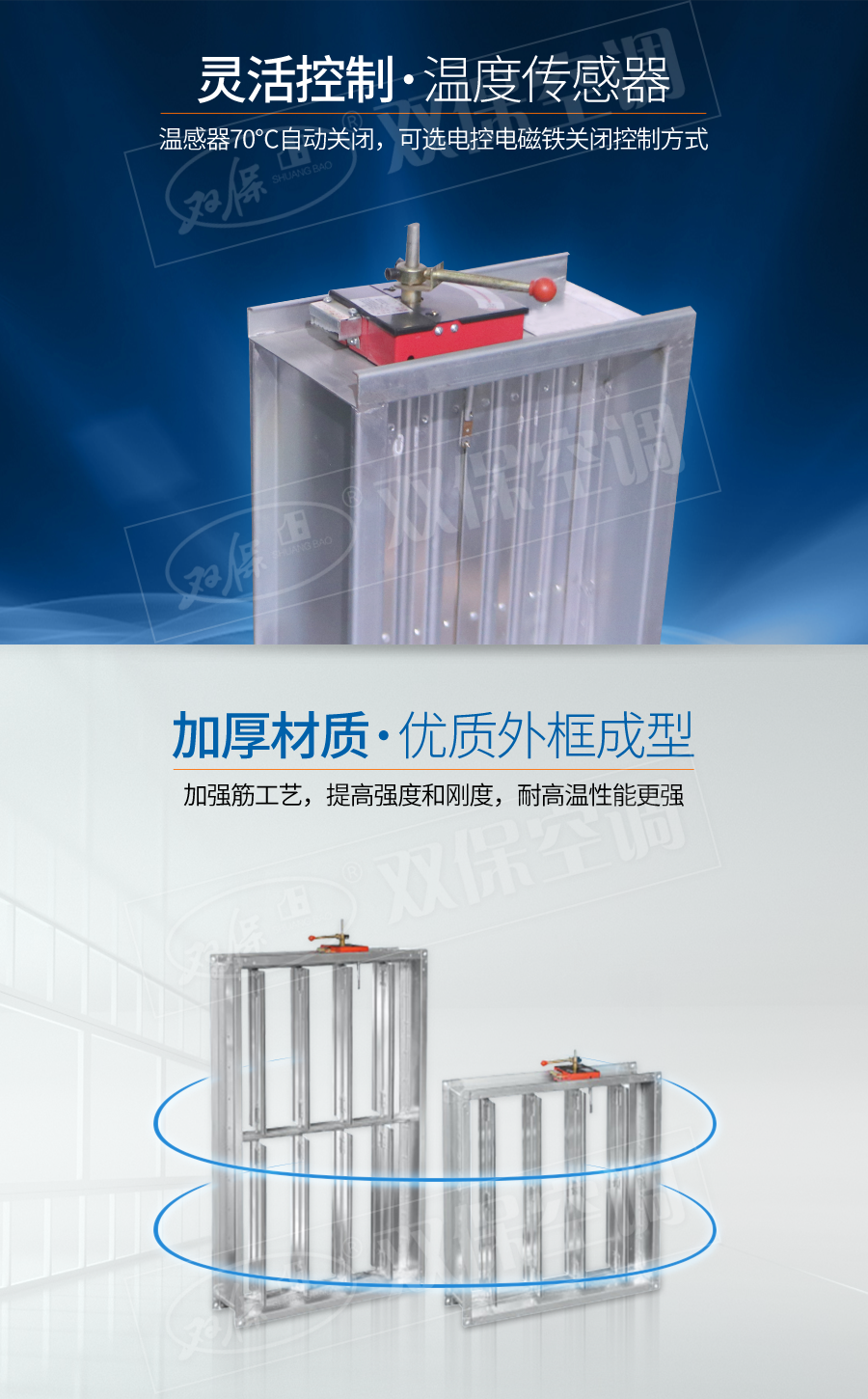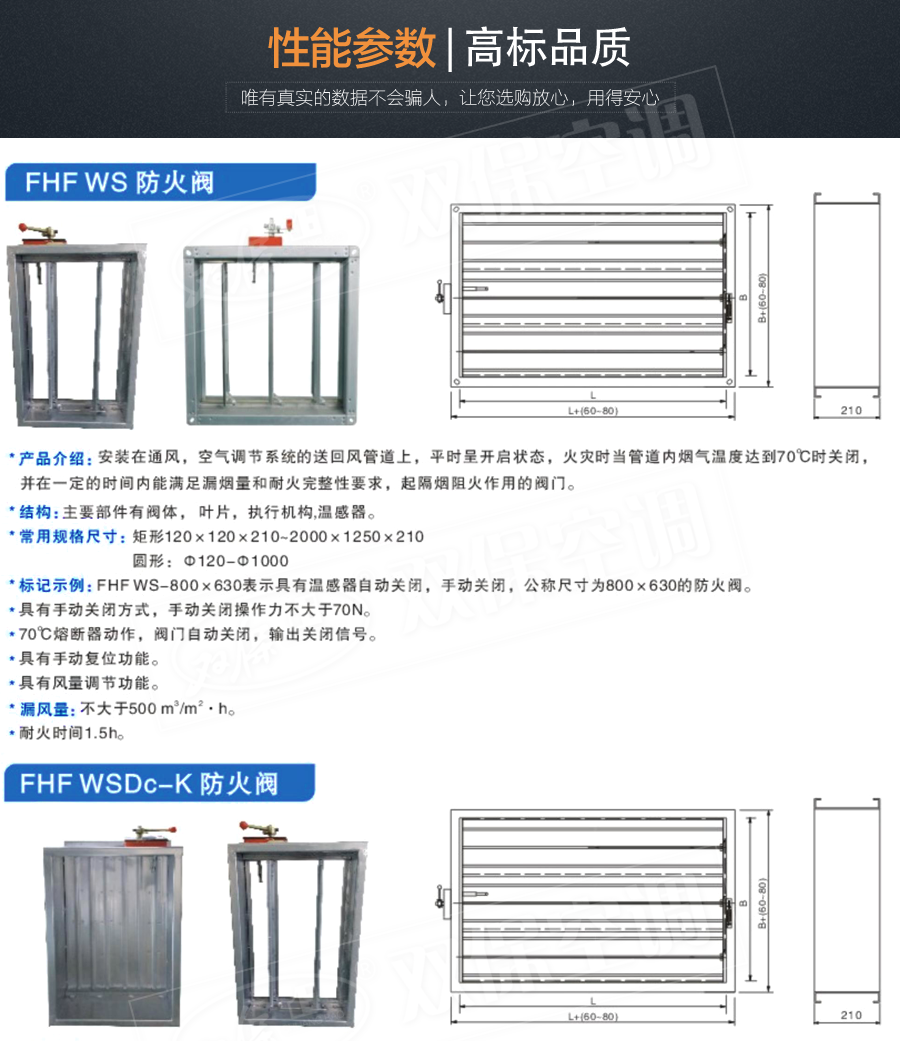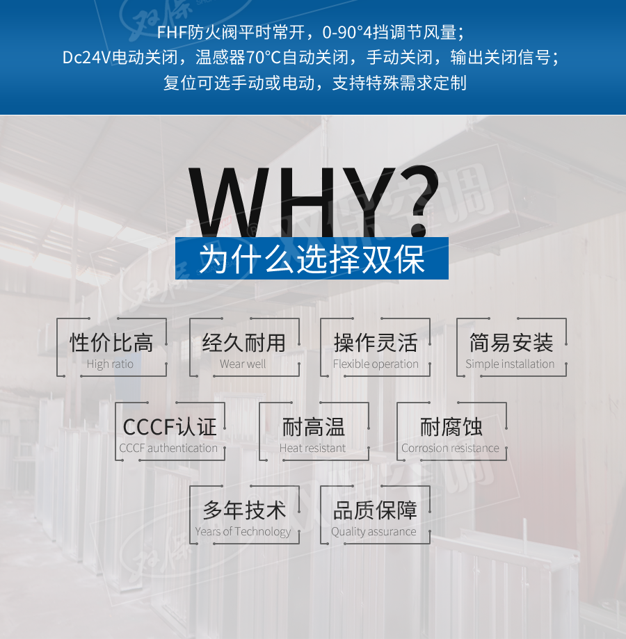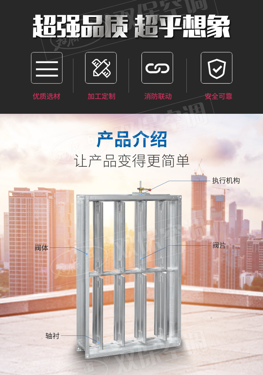 江蘇雙??照{有限公司—防火閥 平時常開,0-90°4擋調節風量; Dc24V電動關閉,溫感器70℃自動關閉,手動關閉,輸出關閉信號; 手動復位。